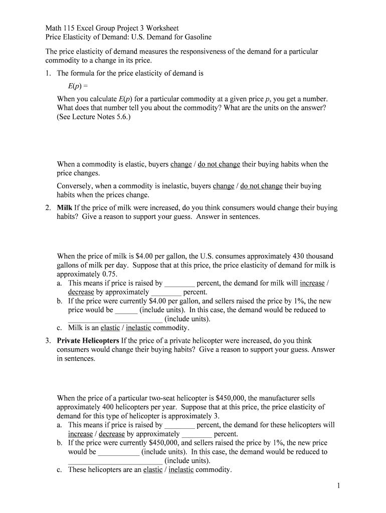 Math 115 Excel Group Project 3 Worksheet Price Elasticity of Demand: U.S. Demand for Gasoline The price elasticity of demand measures the responsiveness of the demand for a particular commodity to