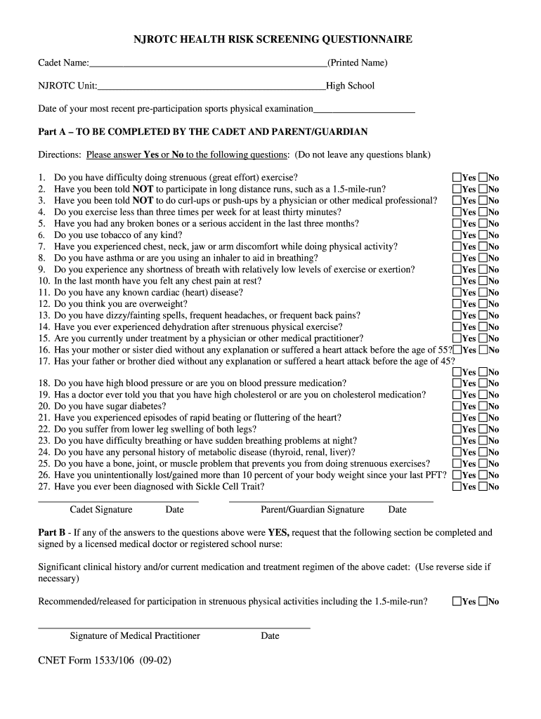 Get the free NJROTC HEALTH RISK SCREENING QUESTIONNAIRE CNET