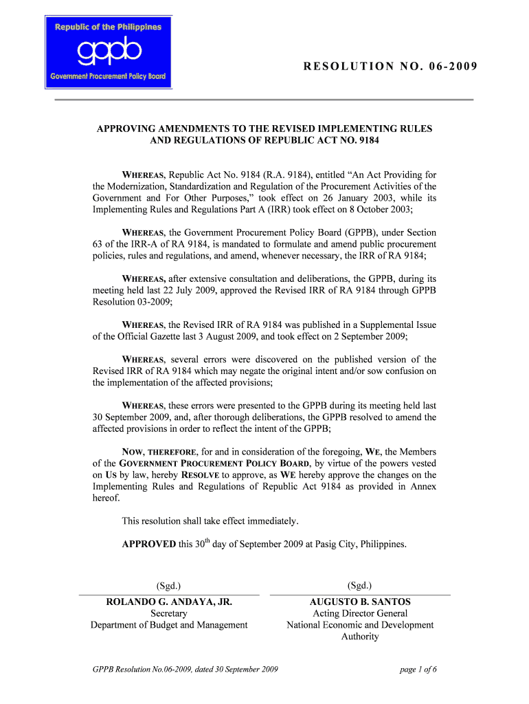 RESOLUTION NO. 062009 APPROVING AMENDMENTS TO THE REVISED IMPLEMENTING RULES AND REGULATIONS OF REPUBLIC ACT NO. 9184 WHEREAS, Republic Act No. 9184 (R.A. 9184), entitled An Act Providing for the