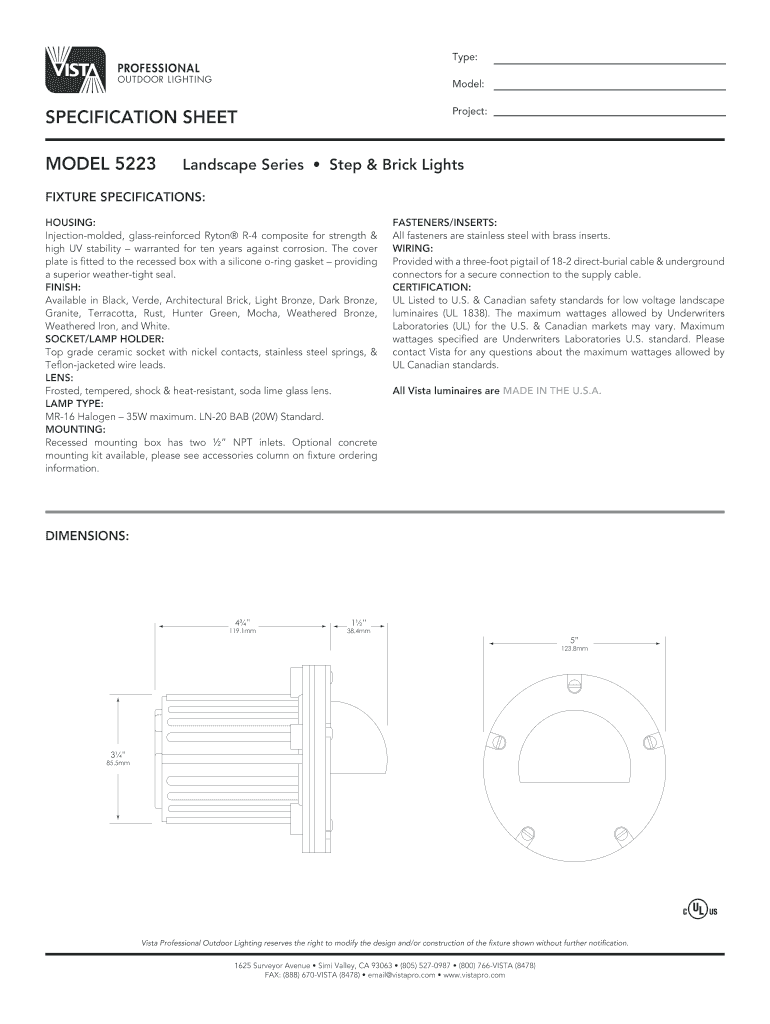 Type: Model: Project: SPECIFICATION SHEET MODEL 5223 Landscape Series Step & Brick Lights FIXTURE SPECIFICATIONS: HOUSING: Injection molded, glass reinforced Ry ton R4 composite for strength & high
