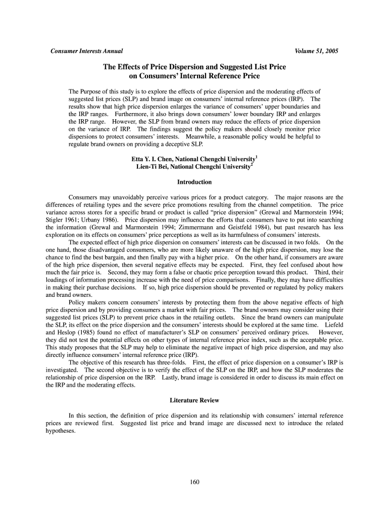 Consumer Interests Annual Volume 51, 2005 The Effects of Price Dispersion and Suggested List Price on Consumers Internal Reference Price The Purpose of this study is to explore the effects of price