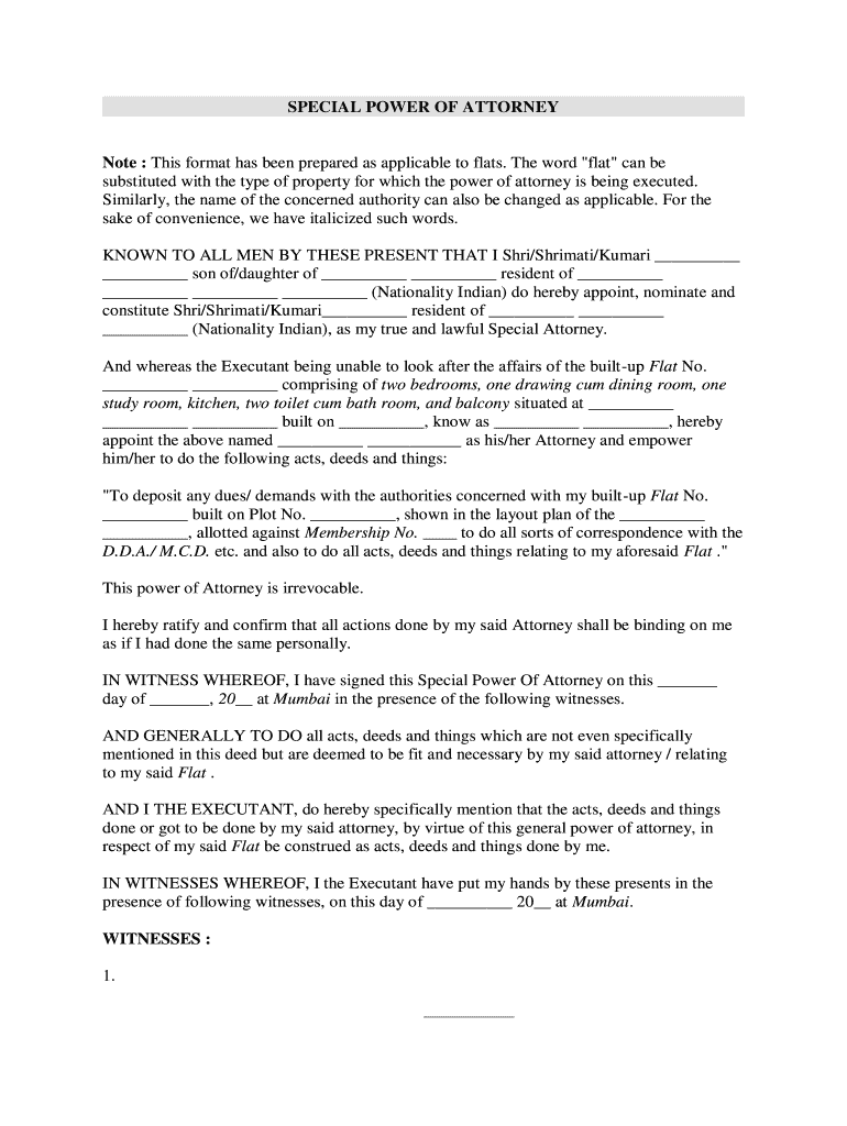 SPECIAL POWER OF ATTORNEYNote : This format has been prepared as applicable to flats. The word flat can be substituted with the type of property for which the power of attorney is being executed.