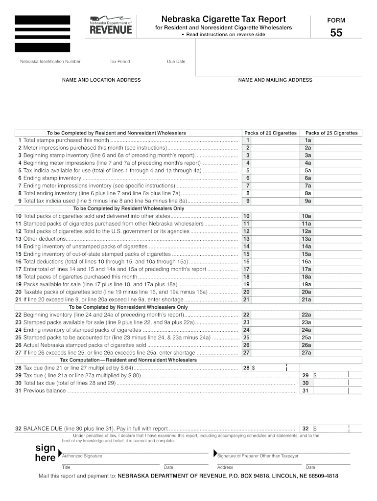 Nebraska Cigarette Tax Report FORM Read instructions on reverse side 55 for Resident and Nonresident Cigarette Wholesalers Nebraska Identity?cation Number Tax Period Due Date RESET FORM NAME AND LOCATION
