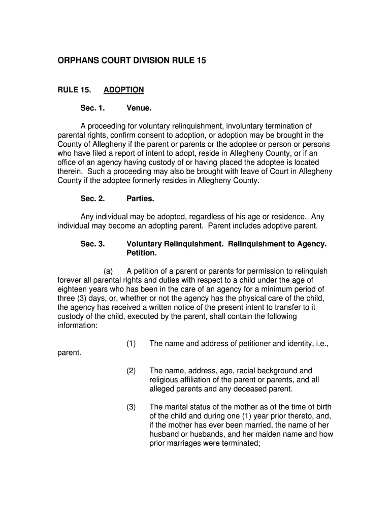 ORPHANS COURT DIVISION RULE 15 RULE 15. ADOPTION Sec. 1. Venue. A proceeding for voluntary relinquishment, involuntary termination of parental rights, confirm consent to adoption, or adoption may