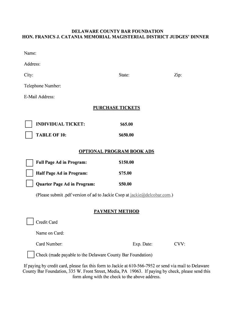 DELAWARE COUNTY BAR FOUNDATION HON. FRANCS J. CATANIA MEMORIAL MAGISTERIAL DISTRICT JUDGES DINNER Name: Address: City: State: Zip: Telephone Number: Email Address: PURCHASE TICKETS INDIVIDUAL TICKET: