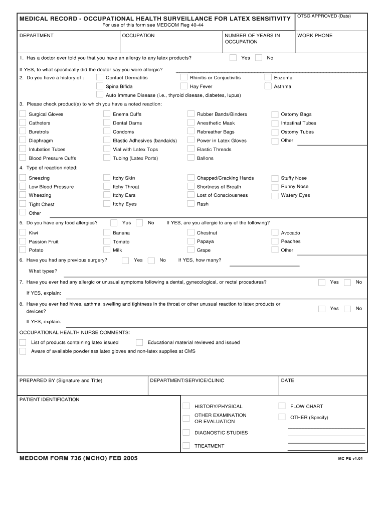 MEDICAL RECORD OCCUPATIONAL HEALTH SURVEILLANCE FOR LATEX SENSITIVITY OSG APPROVED (Date) For use of this form see MED COM Reg 4044 DEPARTMENT OCCUPATION NUMBER OF YEARS IN OCCUPATION 1. Has a doctor