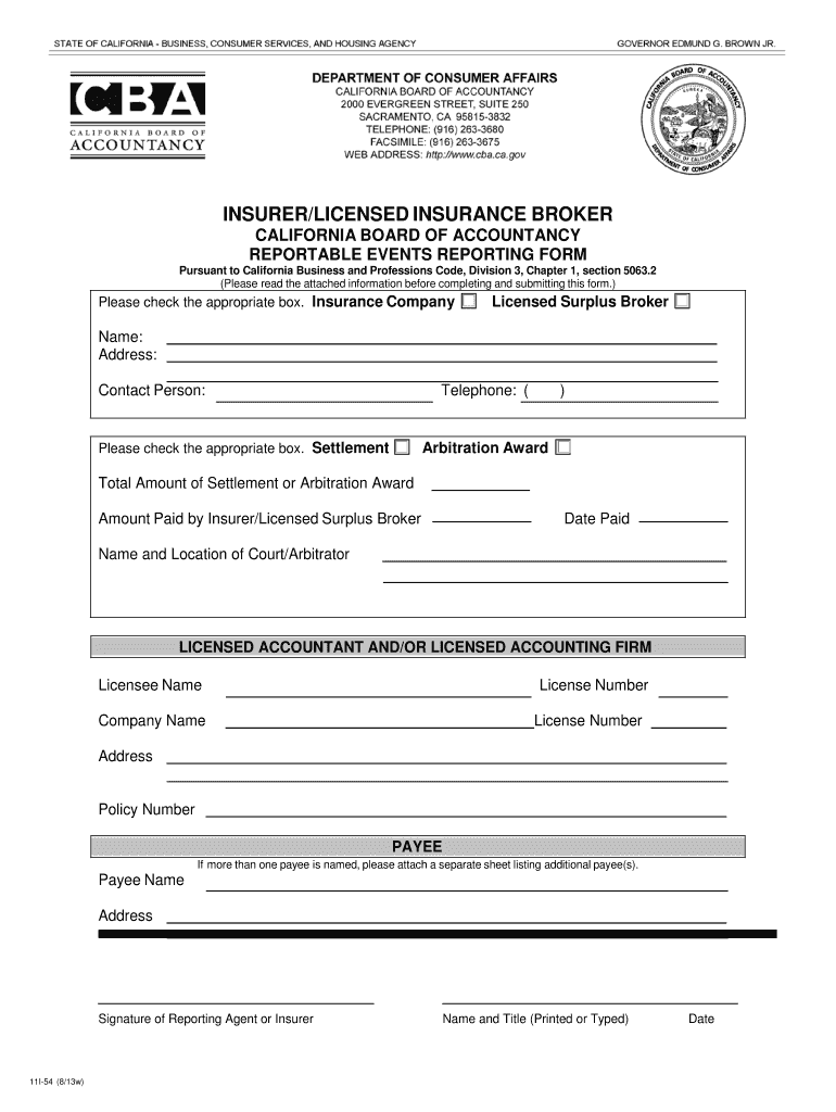 INSURER/LICENSED INSURANCE BROKER CALIFORNIA BOARD OF ACCOUNTANCY REPORTABLE EVENTS REPORTING FORM Pursuant to California Business and Professions Code, Division 3, Chapter 1, section 5063.2 (Please
