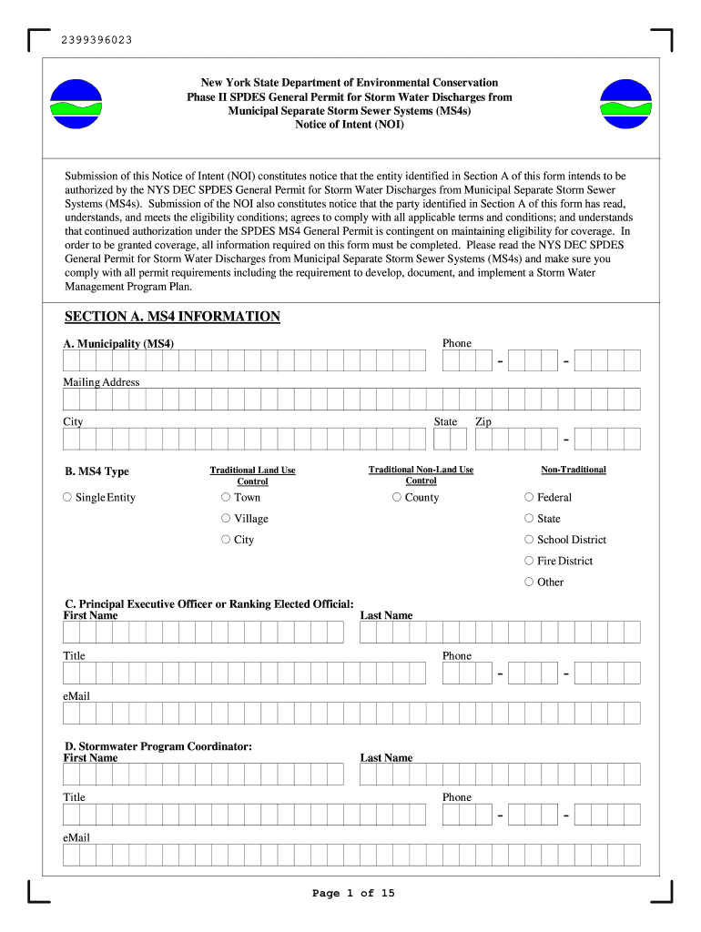 2399396023 New York State Department of Environmental Conservation Phase II SIDES General Permits for Storm Water Discharges from Municipal Separate Storm Sewer Systems (MS4s) Notice of Intent (NOI)