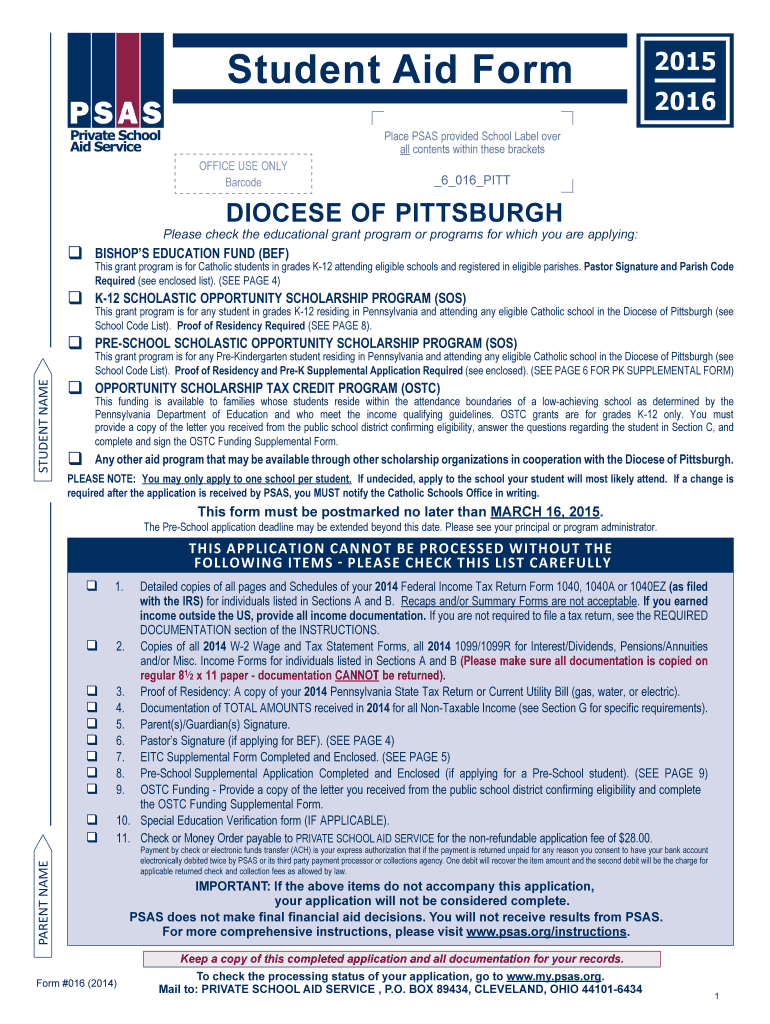 Student Aid Form OFFICE USE ONLY Barcode 2015 2016 Place SAS provided School Label over all contents within these brackets 6 016 PITT DIOCESE OF PITTSBURGH Please check the educational grant program