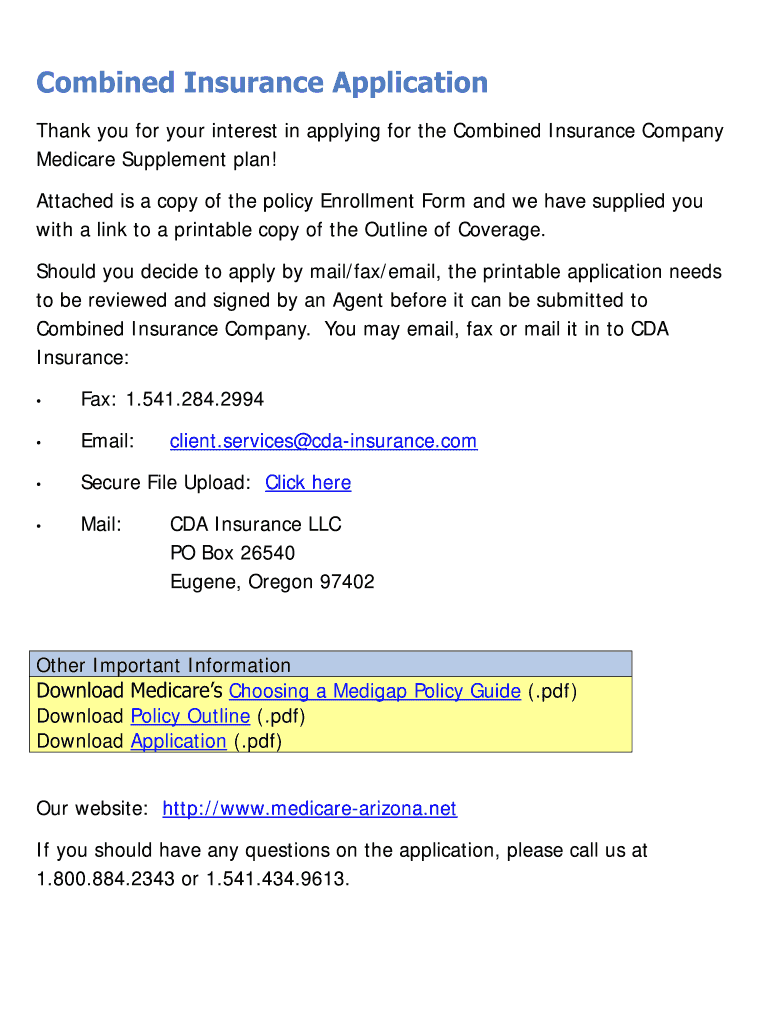 Combined Insurance Application Thank you for your interest in applying for the Combined Insurance Company Medicare Supplement plan! Attached is a copy of the policy Enrollment Form, and we have supplied