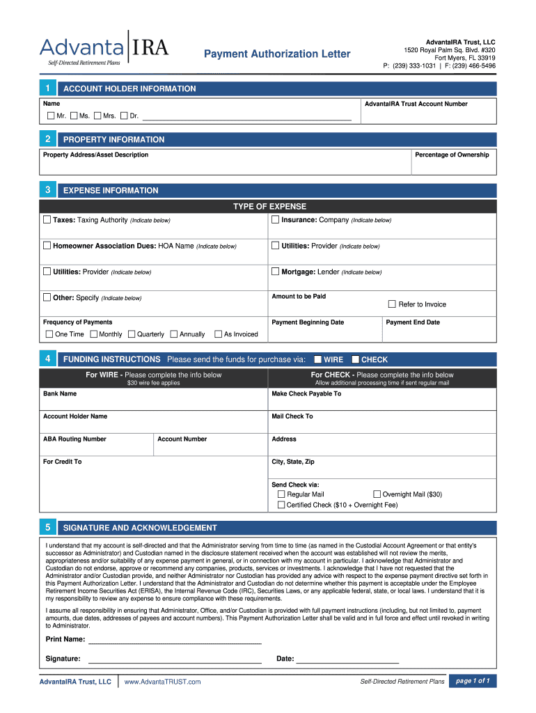 Print Form Advantage Trust, LLC 1520 Royal Palm Sq. Blvd. #320 Fort Myers, FL 33919 P: (239) 3331031 F: (239) 4665496 Payment Authorization Letter 1 ACCOUNT HOLDER INFORMATION Name Advantage Trust