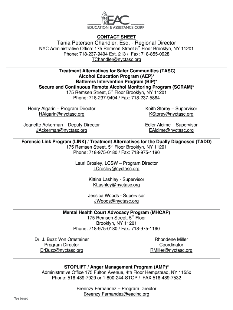 CONTACT SHEET Tania Peterson Chandler, Esq. Regional Director NYC Administrative Office: 175 Rem sen Street 5th Floor Brooklyn, NY 11201 Phone: 7182379404 Ext. 213 / Fax: 7188550928 Chandler nectar.org