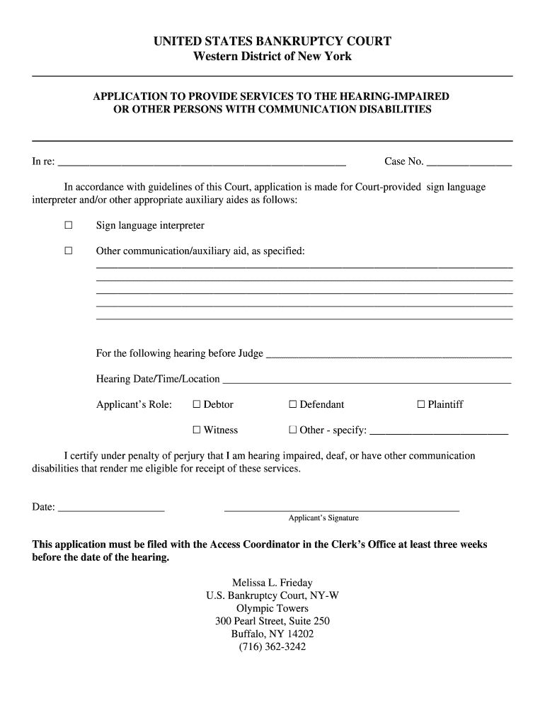 UNITED STATES BANKRUPTCY COURT Western District of New York Paul R. Warren Clerk of Court Buffalo Rochester (716) 5514130 (716) 6134200 SERVICES PROVIDED TO THE HEARING IMPAIRED AND OTHER PERSONS