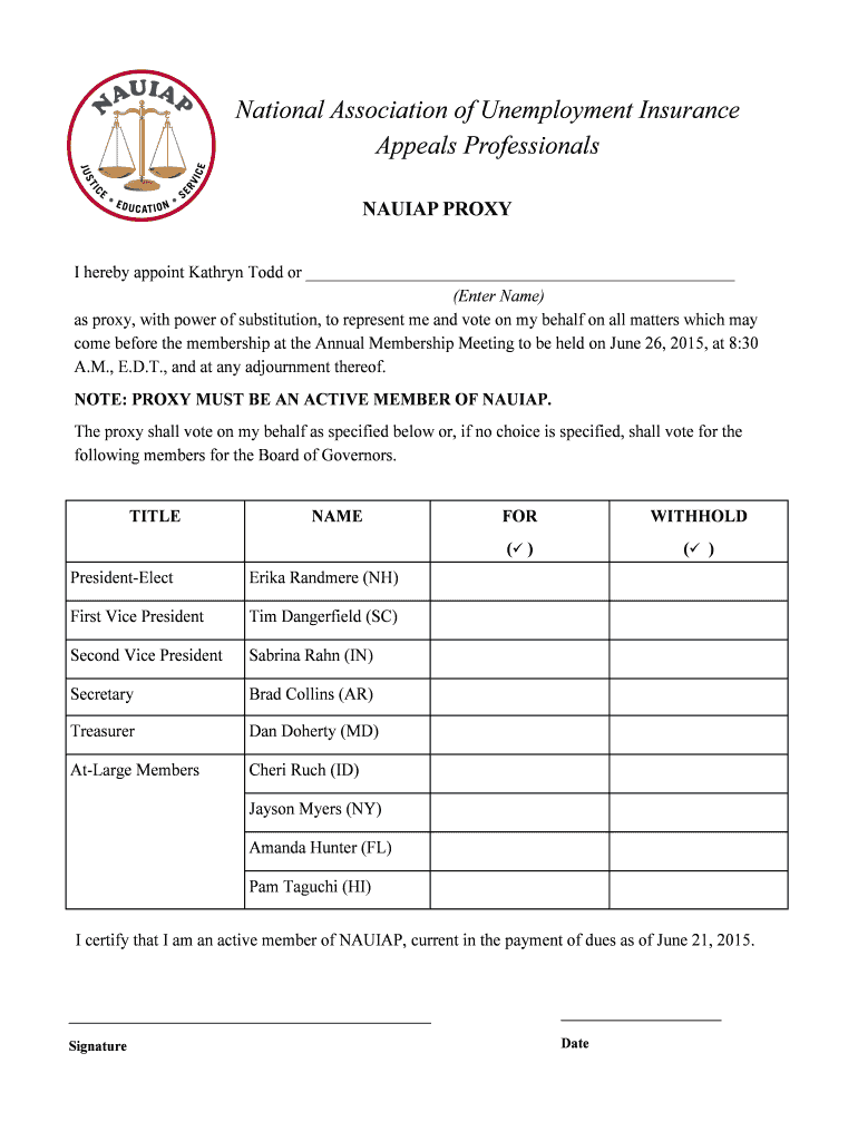 National Association of Unemployment Insurance Appeals Professionals NAU IAP PROXY I hereby appoint Kathryn Todd or (Enter Name) as proxy, with power of substitution, to represent me and vote on my