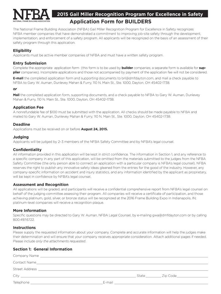 2015 Gail Miller Recognition Program for Excellence in Safety Application Form for BUILDERS The National Frame Building Association (NBA) Gail Miller Recognition Program for Excellence in Safety recognizes