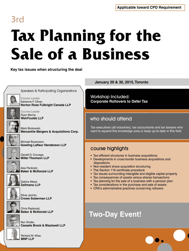 Applicable toward CPD Requirement 3rd Tax Planning for the Sale of a Business Key tax issues when structuring the deal January 29 & 30, 2015, Toronto Speakers & Participating Organizations Course
