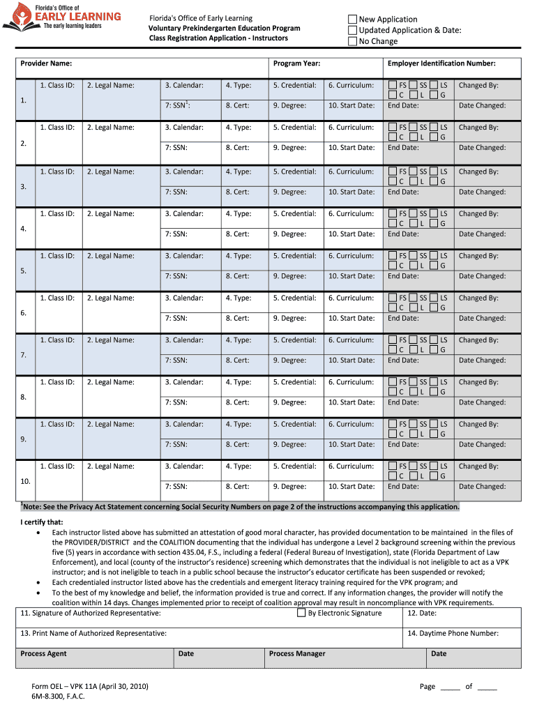 Florida's Office of Early Learning Voluntary Prekindergarten Education Program Class Registration Application Instructors Provider Name: 1. Class ID: New Application Updated Application & Date: No