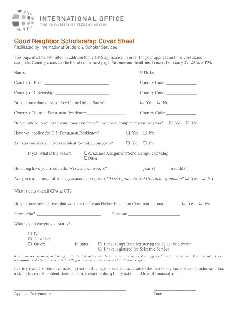Good Neighbor Scholarship Application Facilitated by International Student & Scholar Services Deadline to submit application: Friday, February 27, 2015, 5:00 PM Late applications will not be accepted