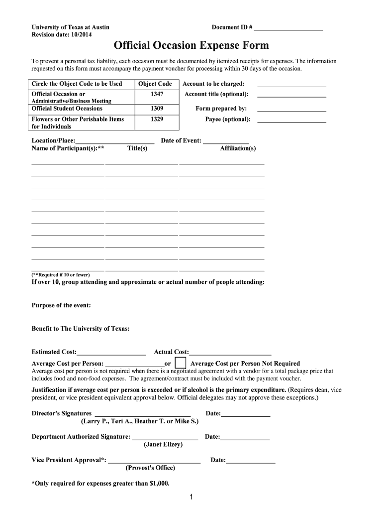 Reset Print University of Texas at Austin Revision date: 10/2014 Document ID # Official Occasion Expense Form To prevent a personal tax liability, each occasion must be documented by itemized receipts