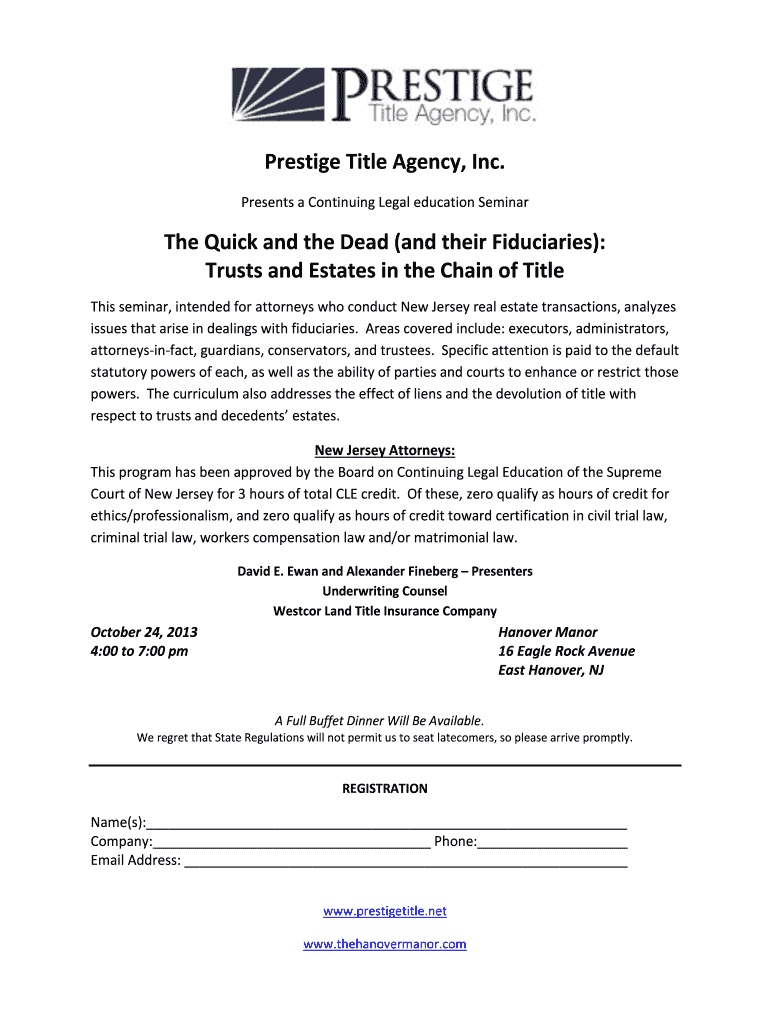 Prestige Title Agency, Inc. Presents a Continuing Legal education Seminar The Quick and the Dead (and their Fiduciaries): Trusts and Estates in the Chain of Title This seminar, intended for attorneys