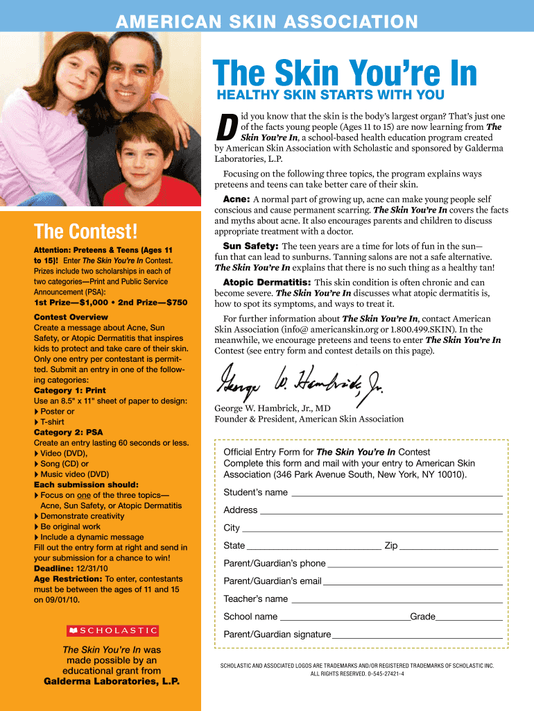 American Skin Association The Skin You're In Healthy skin starts with you D ID you know that the skin is the bodies the largest organ? That's just one of the facts young people (Ages 11 to 15) are