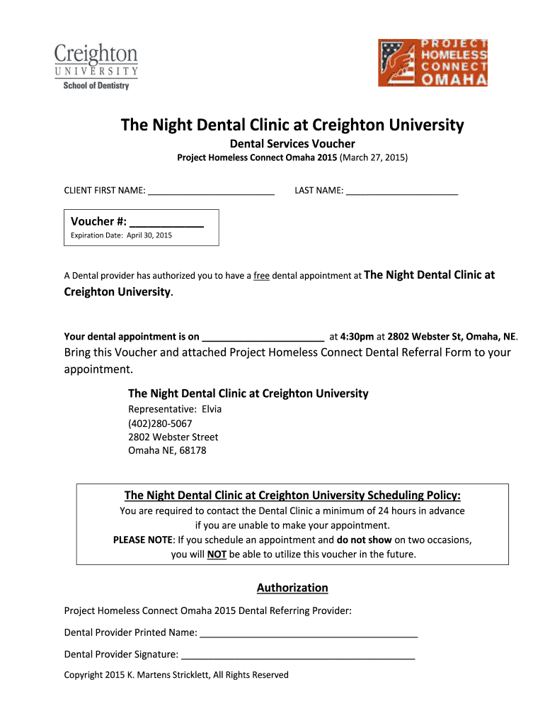 The Night Dental Clinic at Creighton University Dental Services Voucher Project Homeless Connect Omaha 2015 (March 27, 2015) CLIENT FIRST NAME: LAST NAME: Voucher #: Expiration Date: April 30, 2015,