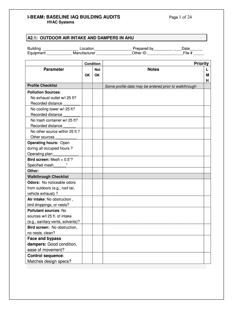I-BEAM: BASELINE IRAQ BUILDING AUDITS Page 1 of 24 HVAC Systems A2.1: OUTDOOR AIR INTAKE AND DAMPERS IN AHU Building Location Prepared by Date Equipment Manufacturer Other ID File # Priority Condition