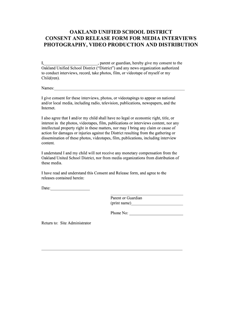 OAKLAND UNIFIED SCHOOL DISTRICT CONSENT AND RELEASE FORM FOR MEDIA INTERVIEWS PHOTOGRAPHY, VIDEO PRODUCTION AND DISTRIBUTION I, parent or guardian, hereby give my consent to the Oakland Unified School