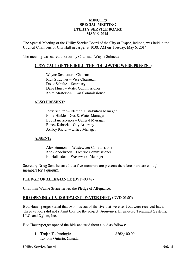 Get the free Utility Service Board 1 5614 MINUTES SPECIAL MEETING - jasperindiana