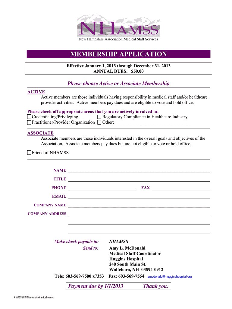 New Hampshire Association Medical Staff Services MEMBERSHIP APPLICATION Effective January 1, 2013, through December 31, 2013, ANNUAL DUES: $50.00 Please choose Active or Associate Membership ACTIVE