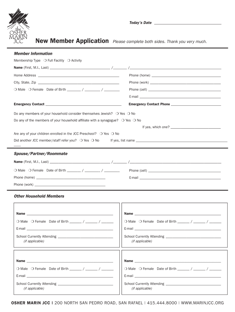 Today's Date New Member Application Please complete both sides. Thank you very much. Member Information Membership Type Full Facility Activity Name (First, M.I., Last) / / Home Address Phone (home)