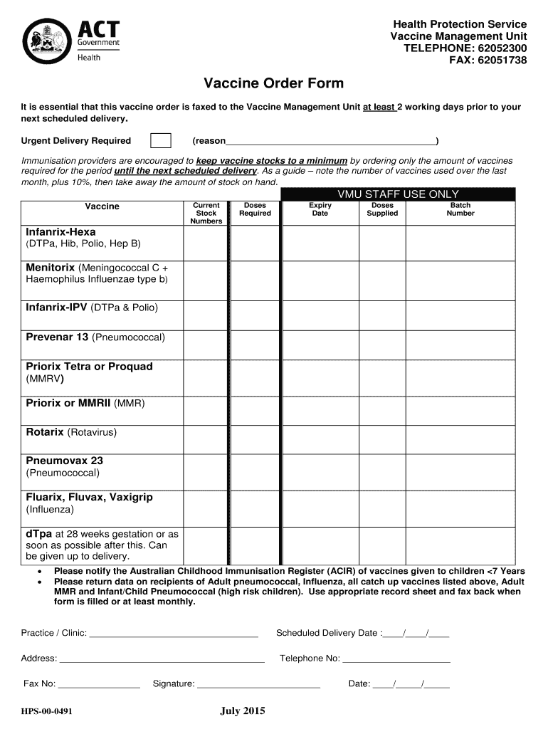 Health Protection Service Vaccine Management Unit TELEPHONE: 62052300 FAX: 62051738 Vaccine Order Form It is essential that this vaccine order is faxed to the Vaccine Management Unit at least 2 working