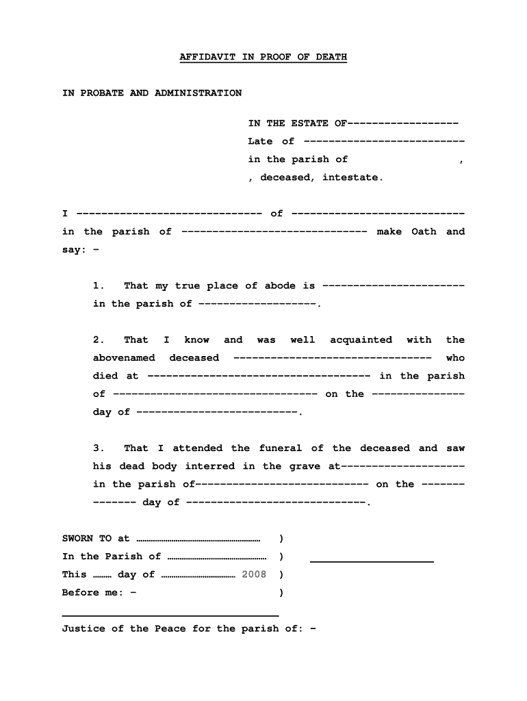AFFIDAVIT IN PROOF OF DEATH IN PROBATE AND ADMINISTRATION IN THE ESTATE Oblate of in the parish of, deceased, intestate. I of in the parish of make Oath and say: 1. That my true place of abode is