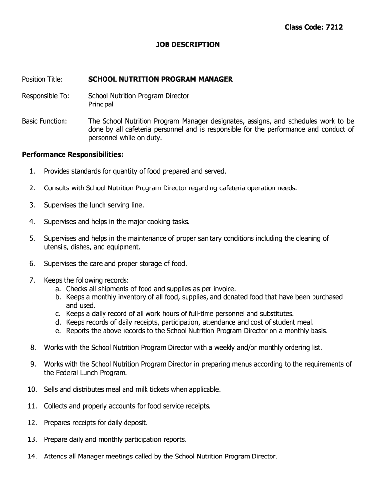 Class Code: 7212 JOB DESCRIPTION Position Title: SCHOOL NUTRITION PROGRAM MANAGER Responsible To: School Nutrition Program Director Principal Basic Function: The School Nutrition Program Manager designates,