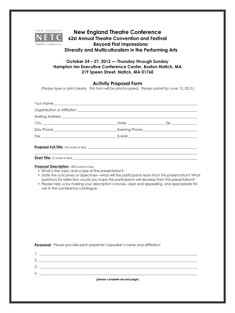 Get the free B2013b NETC Conference Proposal Form - New England Theatre bb - netconline