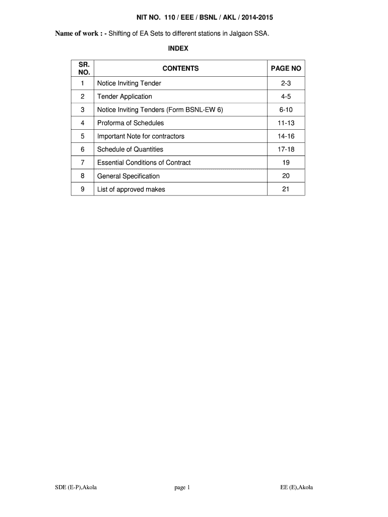 NIT NO. 110 / EEE / BSNL / AKL / 20142015 Names of work : Shifting of EA Sets to different stations in Jalgaon SSA. INDEX SR. NO. CONTENTS PAGE NO 1 Notice Inviting Tender 23 2 Tender Application