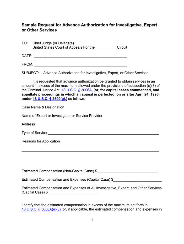 Sample Request for Advance Authorization for Investigative, Expert or Other Services TO: Chief Judge (or Delegate) United States Court of Appeals For the Circuit DATE: FROM: SUBJECT: Advance Authorization