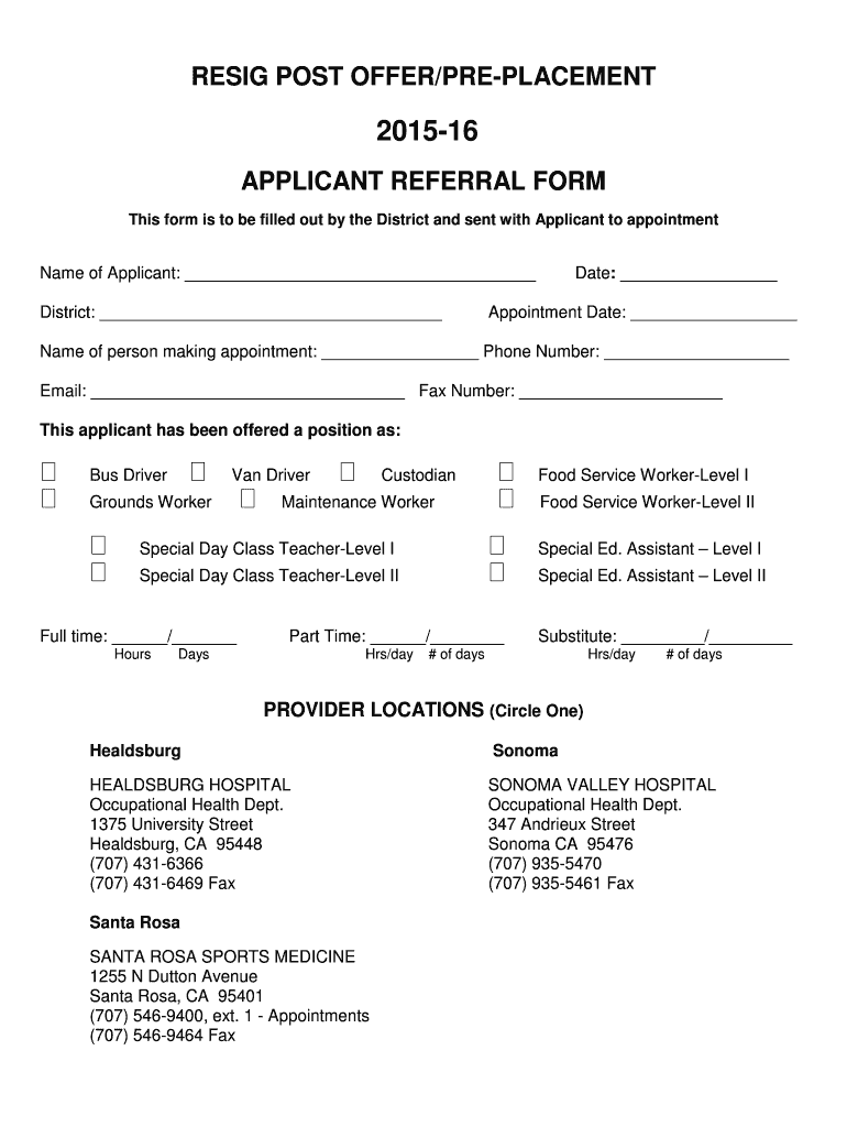 RESIGN POST OFFER/REPLACEMENT 201516 APPLICANT REFERRAL From This form is to be filled out by the District and sent with Applicant to appointment Name of Applicant: District: Date: Appointment Date: