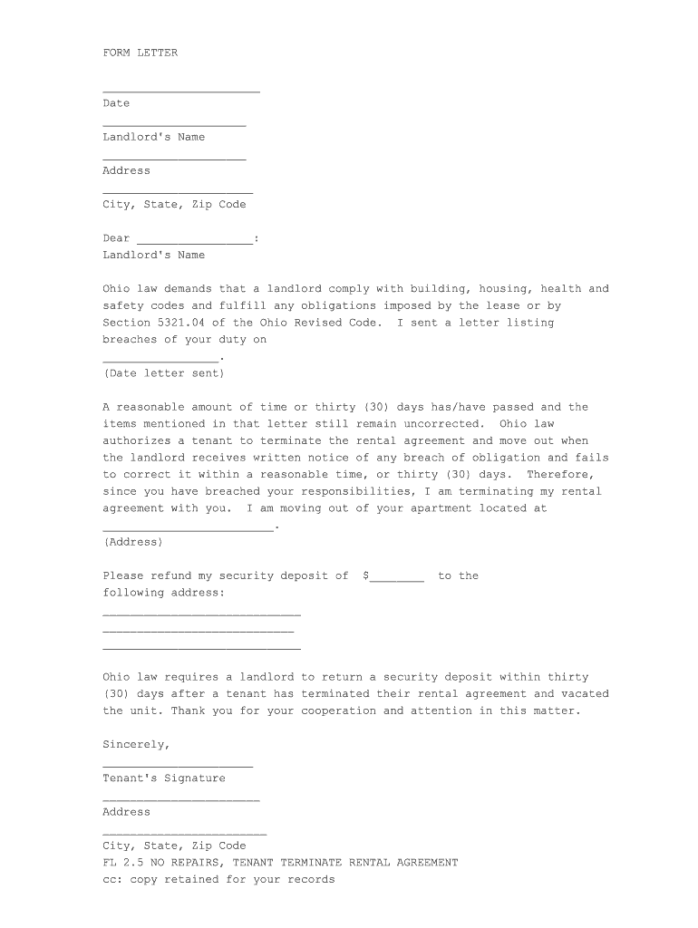 FORM LETTER Date Landlord's Name Address City, State, Zip Code Dear : Landlord's Name Ohio law demands that a landlord comply with building, housing, health and safety codes and fulfill any obligations