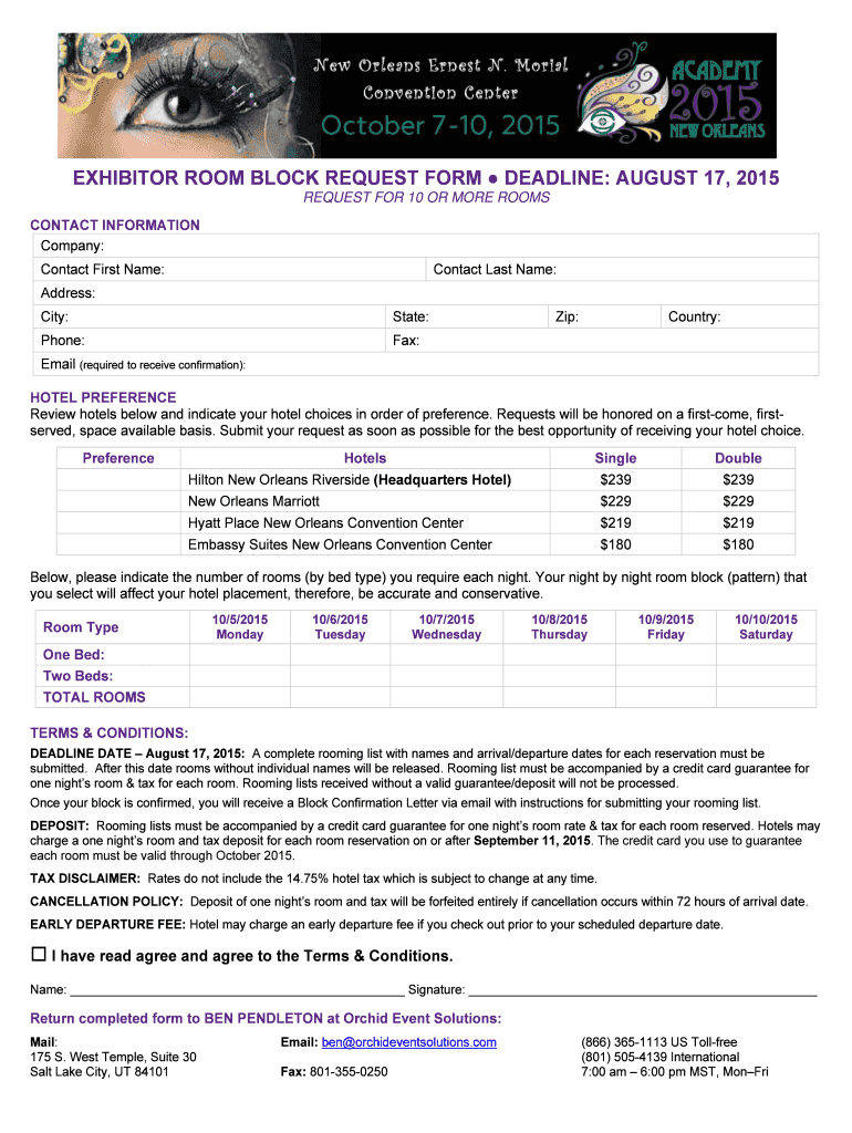EXHIBITOR ROOM BLOCK REQUEST FORM DEADLINE: AUGUST 17, 2015, REQUEST FOR 10 OR MORE ROOMS CONTACT INFORMATION Company: Contact First Name: Contact Last Name: Address: City: State: Phone: Zip: Country: