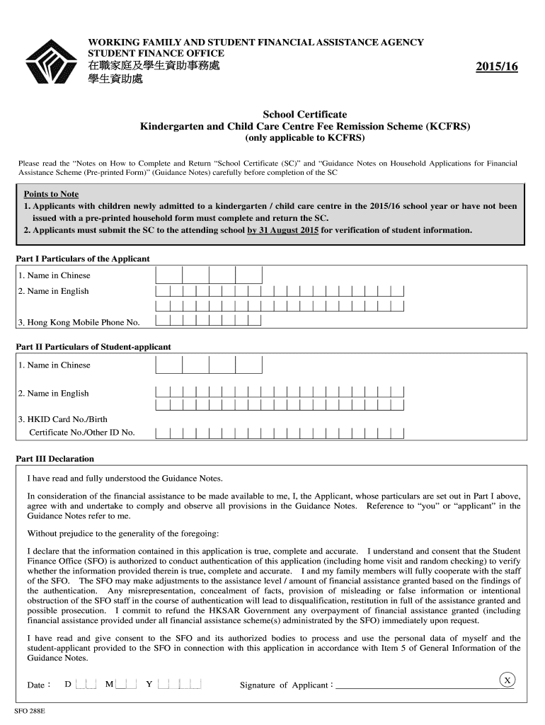 WORKING FAMILY AND STUDENT FINANCIAL ASSISTANCE AGENCY STUDENT FINANCE OFFICE 2015/16 School Certificate Kindergarten and Child Care Center Fee Remission Scheme (KC FRS) (only applicable to KC FRS)