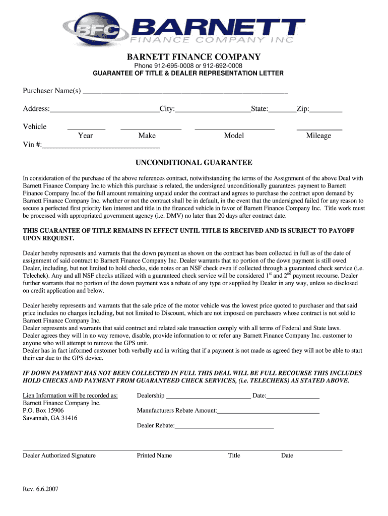 BARNETT FINANCE COMPANY Phone 9126950008 or 9126920008 Guarantees OF TITLE & DEALER REPRESENTATION LETTER Purchaser Name(s) (s) Address: Vehicle City: Year Make State: Zip: Model Mileage VIN #: UNCONDITIONAL