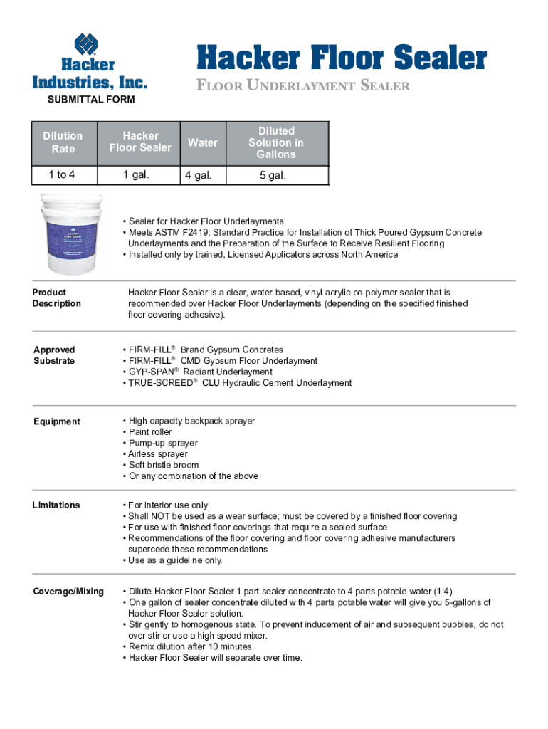 Hacker Industries, Inc. www.HackerIndustries.comSUBMITTAL Formulation Rate 1 to 4Hacker Floor Sealer 1 gal. Hacker Floor Sealer Floor Underpayment Sealer WaterDiluted Solution in Gallons4 gal.5 gal.
