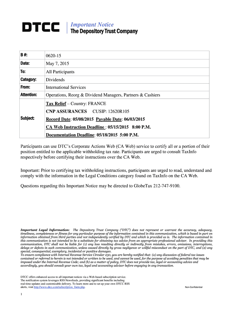 Important Notice The Depository Trust Company B #: 062015 Date: May 7, 2015, To: All Participants Category: Dividends From: International Services Attention: Operations, Reorg & Dividend Managers,