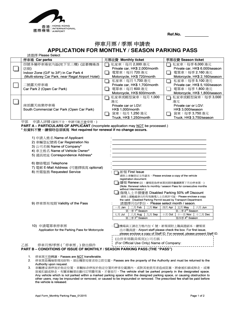 Ref.No. / APPLICATION FOR MONTHLY / SEASON PARKING PASS Please Select Car parks () () Indoor Zone (G/F to 3/F) in Car Park 4 (Multistory Car Park, near Regal Airport Hotel) Car Park 2 (Open Car Park)