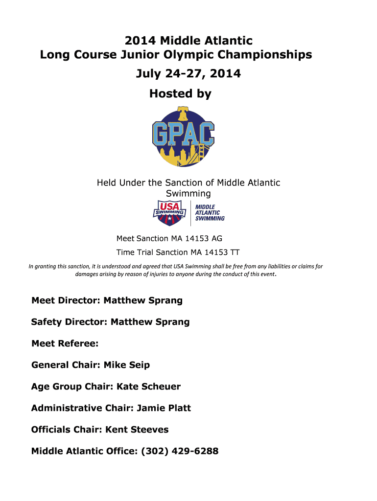 2014 Middle Atlantic Long Course Junior Olympic Championships July 24-27, 2014 Hosted by Held Under the Sanction of Middle Atlantic Swimming Meet Sanction MA 14153 AG Time Trial Sanction MA 14153