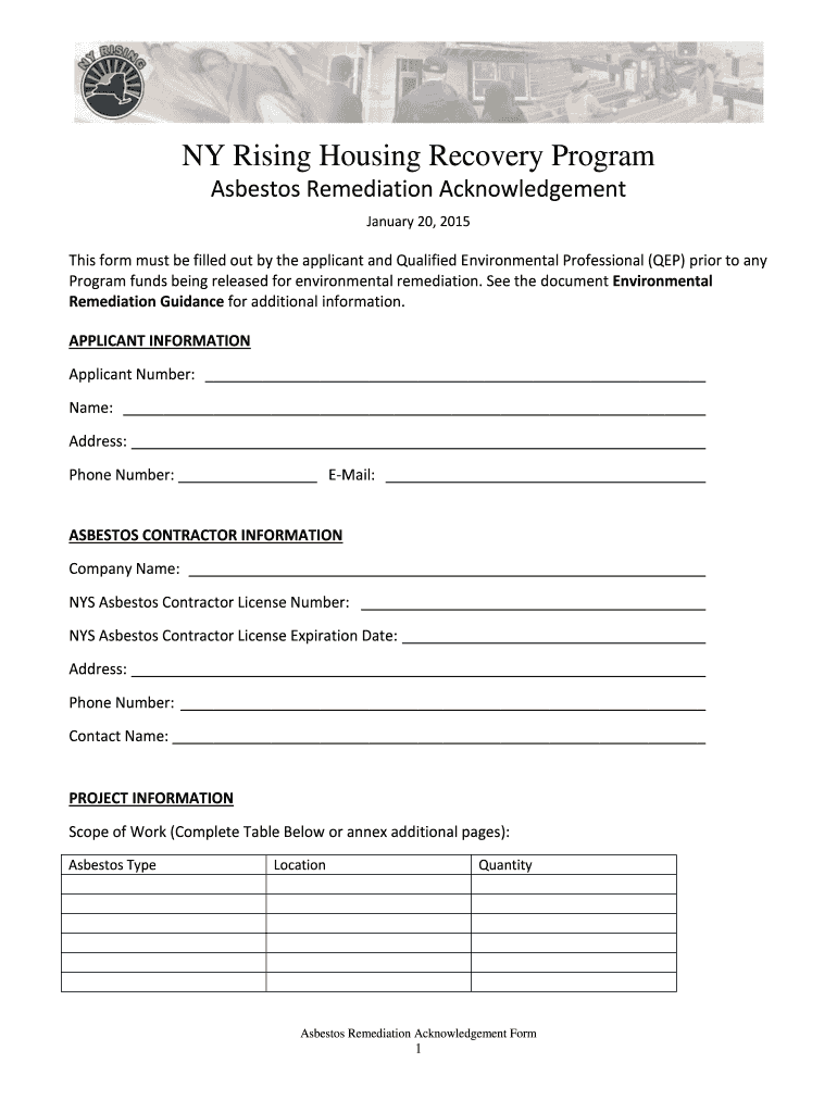 NY Rising Housing Recovery Program Asbestos Remediation Acknowledgement January 20, 2015, This form must be filled out by the applicant and Qualified Environmental Professional (REP) prior to any
