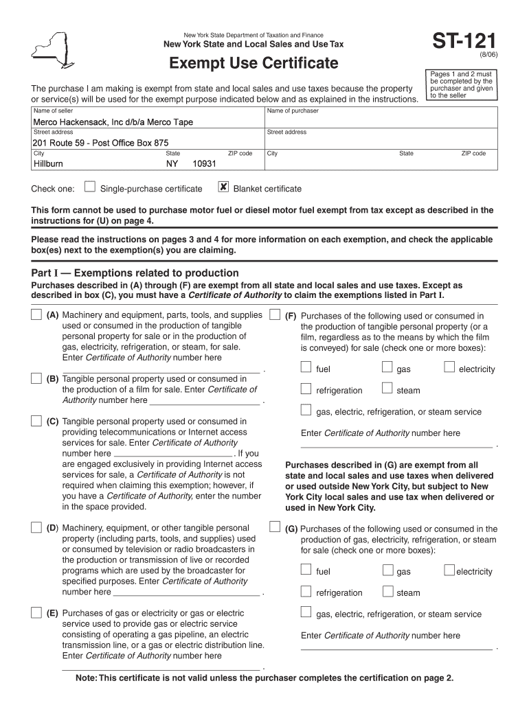 ST121 New York State Department of Taxation and Finance New York State and Local Sales and Use Tax (8/06) Exempt Use Certificate The purchase I am making is exempt from state and local sales and use