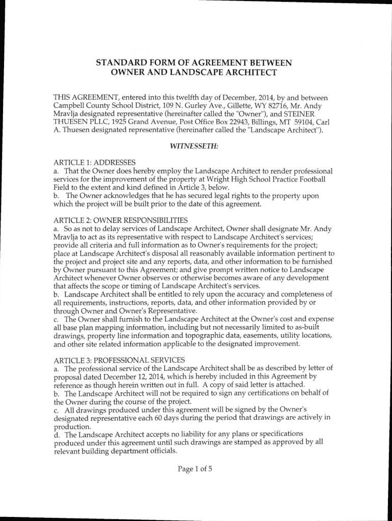 STANDARD FORM OF AGREEMENT BETWEEN OWNER AND LANDSCAPE ARCHITECT THIS AGREEMENT, entered into this twelfth day of December 2014, by and between Campbell County School District, 109 N. Gurley Ave.,
