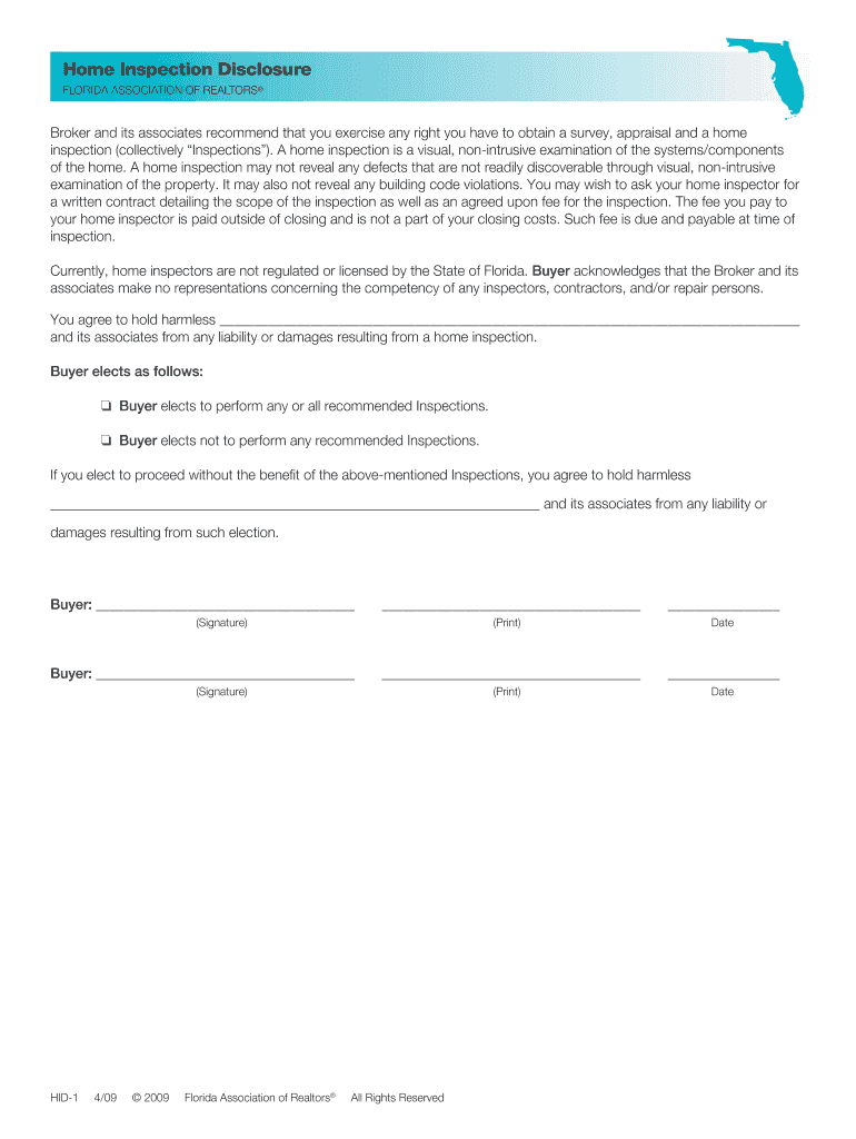 Home Inspection Disclosure FLORIDA ASSOCIATION OF REALTORS Broker and its associates recommend that you exercise any right you have to obtain a survey, appraisal and a home inspection (collectively